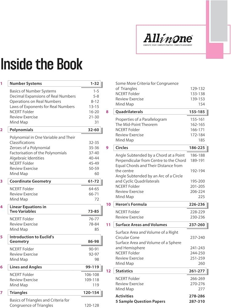 Number Systems, Polynomials, Coordinate Geometry, Linear Equations in Two Variables, Introduction to Euclid’s Geometry, Linear and Angles, Triangles, Quadrilaterals, Circles, Heron’s Formula, Surface Areas and Volumes, Statistics, Activities, 5 Sample Question Papers