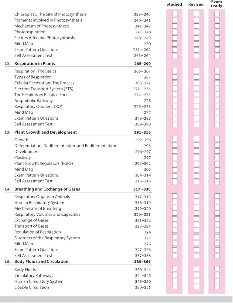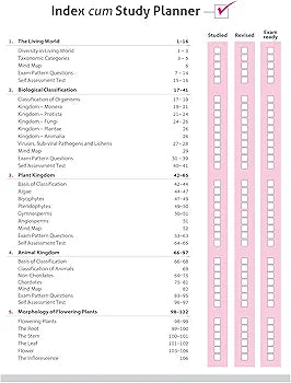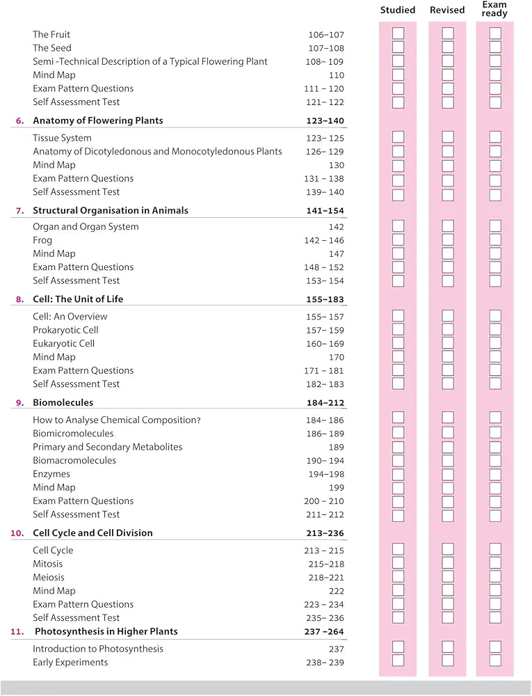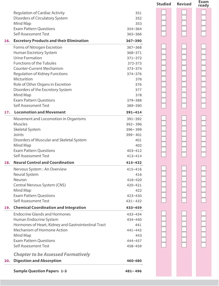 The Living World, Biological Classification, Plant Kingdom, Animal Kingdom, Morphology of Flowering Plants, Anatomy of Flowering Plants, Structural Organisation in Animals, Cell: The Unit of Life, Biomolecules, Cell Cycle and Cell Division, Photosynthesis in Higher Plants, Respiration in Plants, Plant Growth and Development, Breathing and Exchange of Gases, Body Fluids and Circulation, Excretory Products and their Elimination, Locomotion and Movement, Neural Control and Coordination, Chemical Coordination and Integration, Sample Question Papers (1-3)