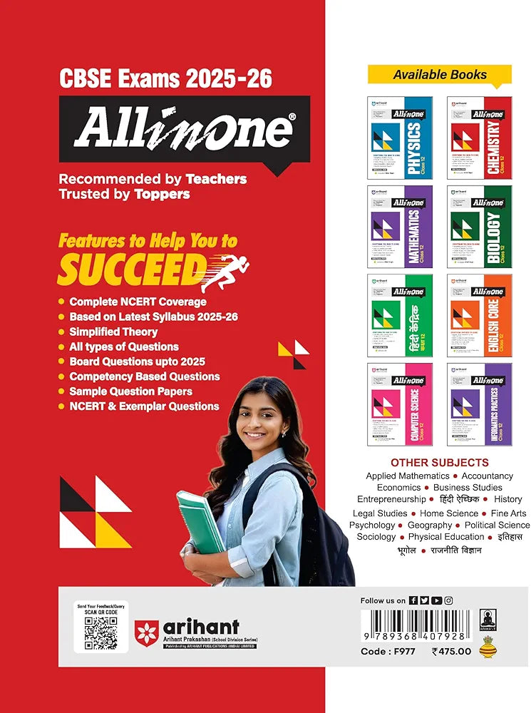 Arihant's All-in-One series has been the #1 choice of students and teachers for over a decade. Known for its well-structured content, exam-oriented approach, and easy-to-understand language, this series ensures complete concept clarity and thorough practice. Each book is meticulously crafted to align with the latest CBSE syllabus and exam pattern, making it a trusted companion for students aiming for academic excellence.