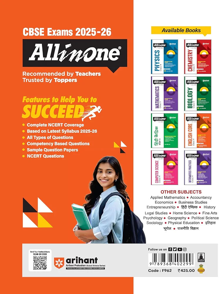 Arihant's All-in-One series has been the #1 choice of students and teachers for over a decade. Known for its well-structured content, exam-oriented approach, and easy-to-understand language, this series ensures complete concept clarity and thorough practice. Each book is meticulously crafted to align with the latest CBSE syllabus and exam pattern, making it a trusted companion for students aiming for academic excellence.