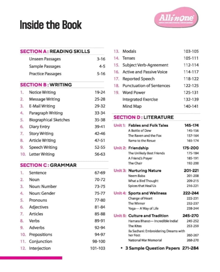 Section A: Reading Skills, Section B: Writing, Section C: Grammar, Section D: Literature