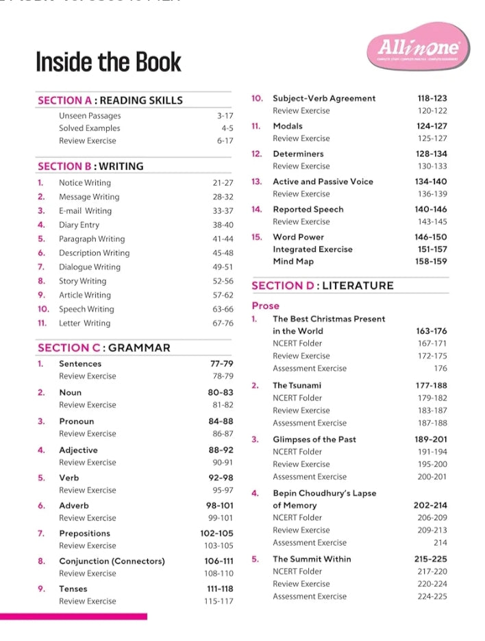 Section A: Reading Skills, Section B: Writing Skills, Section C: Grammar, Section D: Literature, 3 Sample Question Papers