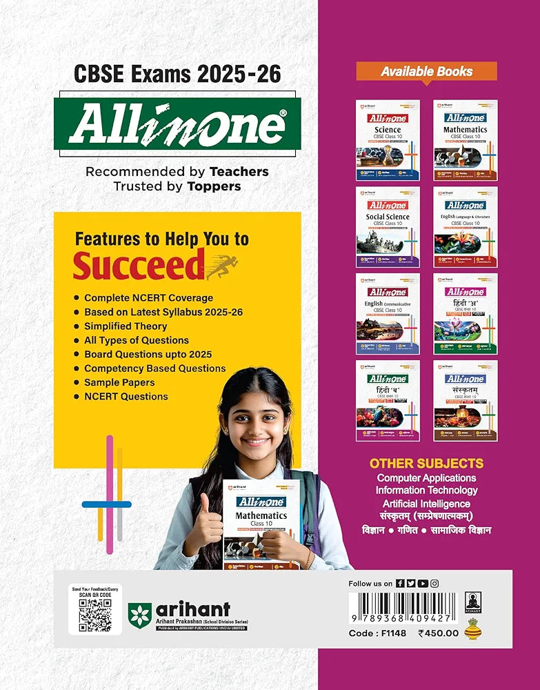 Arihant's All-in-One series has been the #1 choice of students and teachers for over a decade. Known for its well-structured content, exam-oriented approach, and easy-to-understand language, this series ensures complete concept clarity and thorough practice. Each book is meticulously crafted to align with the latest CBSE syllabus and exam pattern, making it a trusted companion for students aiming for academic excellence.