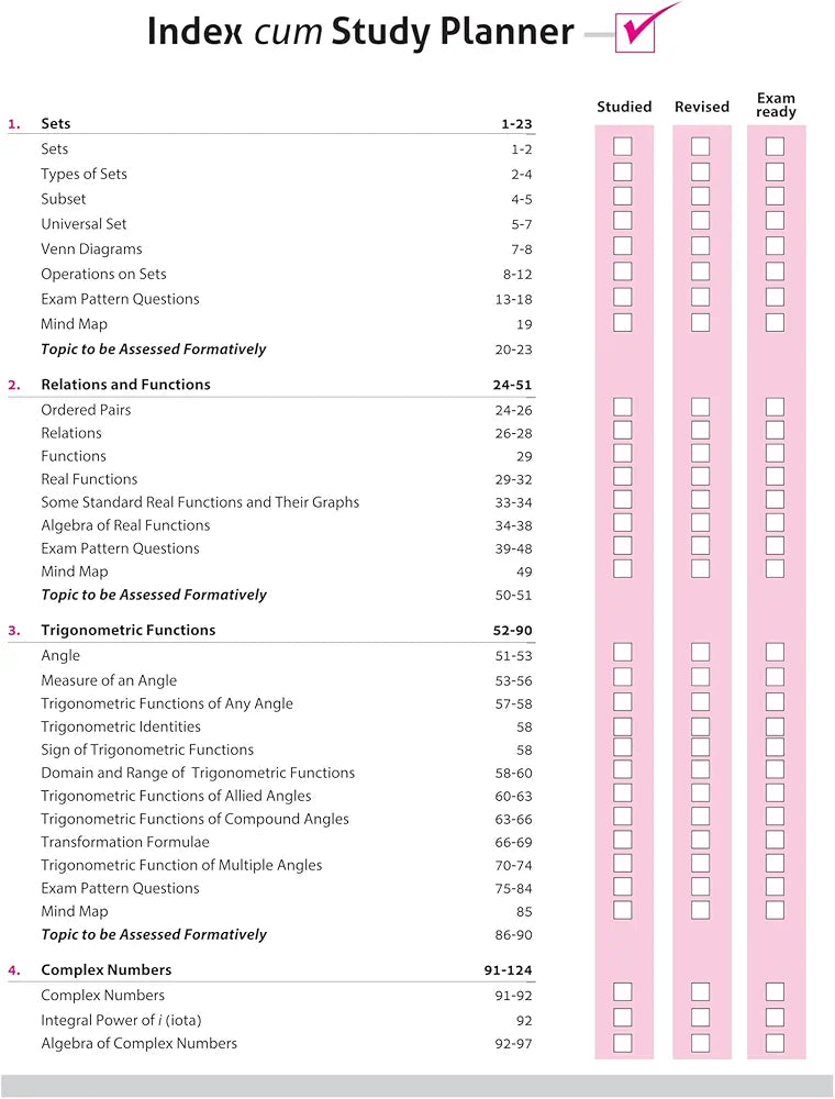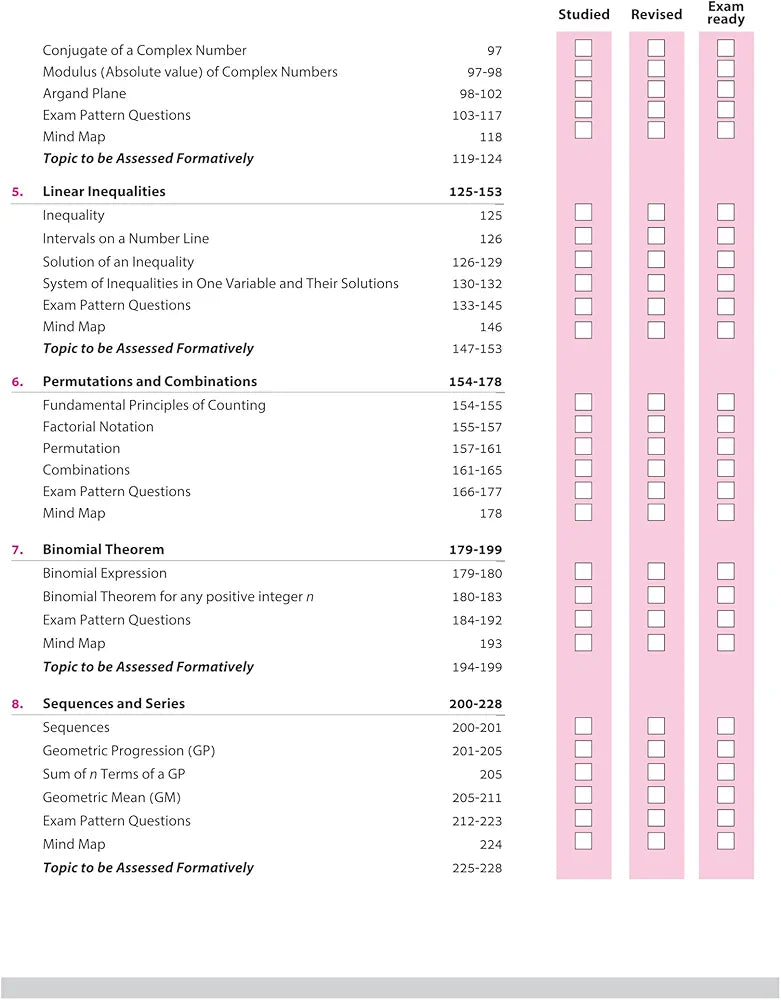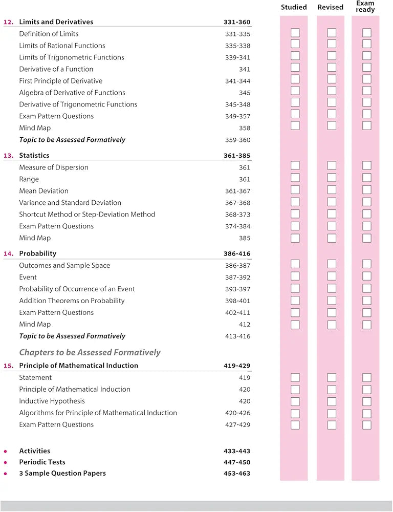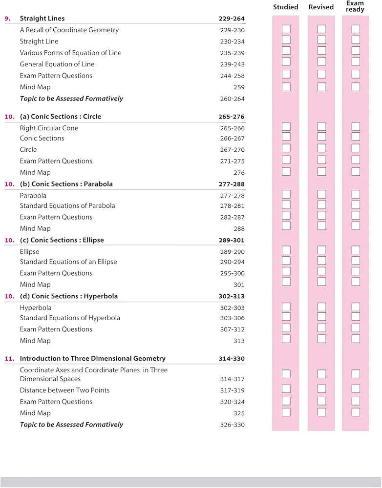Sets, Relations and Functions, Trigonometric Functions, Complex Numbers, Linear Inequalities, Permutations and Combinations, Binomial Theorem, Sequences and Series, Straight Lines, Conic Sections: Circle, Conic Sections: Parabola, Conic Sections: Ellipse, Conic Sections: Hyperbola, Introduction to Three Dimensional Geometry, Limits and Derivatives, Statistics, Probability, Activities, Periodic Tests, Sample Question Papers (1-3)