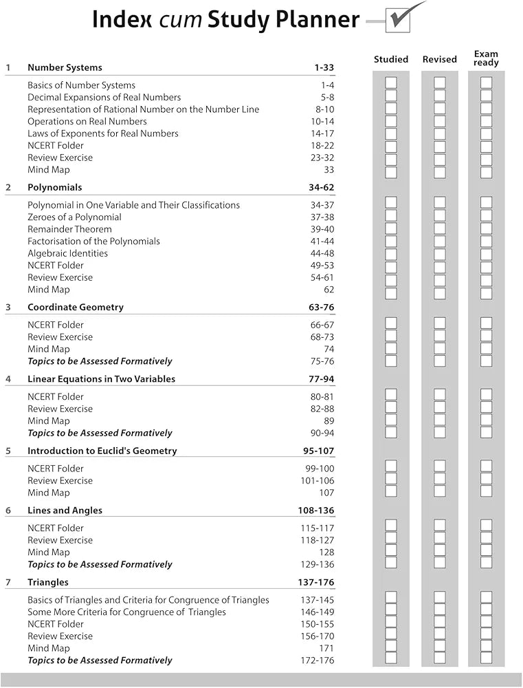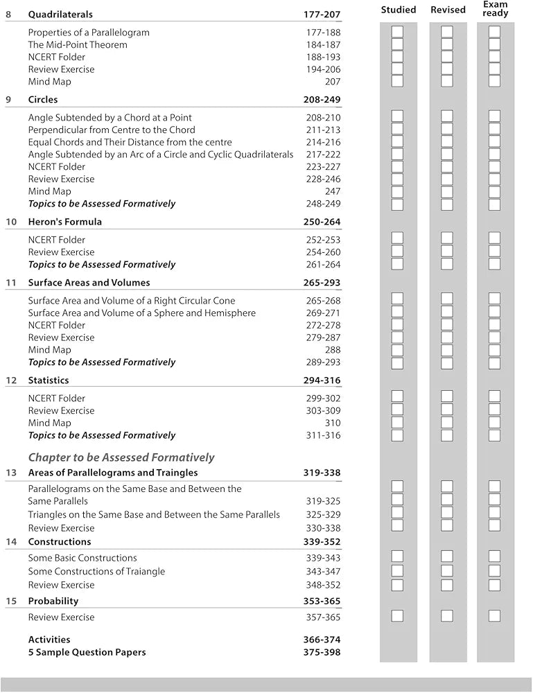 Number Systems, Polynomials, Coordinate Geometry, Linear Equations in Two Variables, Introduction to Euclid’s Geometry, Lines and Angles, Triangles, Quadrilaterals, Circes, Heron’s Formula, Surface Areas and Volumes, Statistics, Areas of Parallelograms and Triangles, Constructions, Probability, Activities Sample Question Papers (1-5)