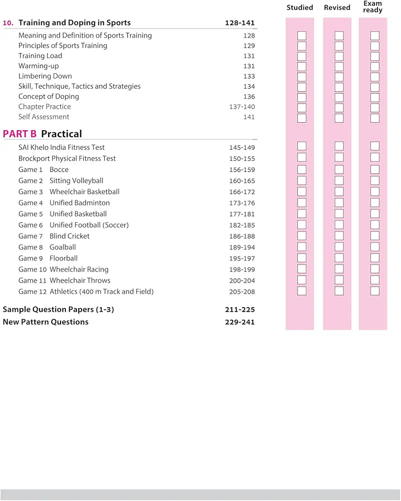 PART A (Theory): Changing Trends and Career in Physical Education, Olympism, Yoga, Physical Education and Sports for CWSN, Physical Fitness, Health and Wellness, Test, Measurement and Evaluation, Fundamentals of Anatomy and Physiology in Sports, Fundamentals of Kinesiology and Biomechanics in Sports, Psychology and Sports, Training and Doping in Sports, PART B (Practical), Sample Question Papers (1-3), New Pattern Questions