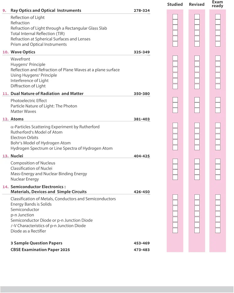 Electric Charges and Fields, Electrostatic Potential and Capacitance, Current Electricity, Moving Charges and Magnetism, Magnetism and Matter, Electromagnetic Induction, Alternating Current, Electromagnetic Waves, Ray Optics and Optical Instruments, Wave Optics, Dual Nature of Radiation and Matter, Atoms, Nuclei, Semiconductor Electronics: Materials, Devices and Simple Circuits, Sample Question Papers (1-3), CBSE Examination Paper 2025