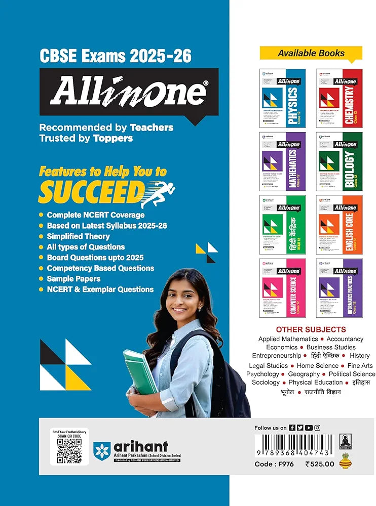 Arihant's All-in-One series has been the #1 choice of students and teachers for over a decade. Known for its well-structured content, exam-oriented approach, and easy-to-understand language, this series ensures complete concept clarity and thorough practice. Each book is meticulously crafted to align with the latest CBSE syllabus and exam pattern, making it a trusted companion for students aiming for academic excellence.