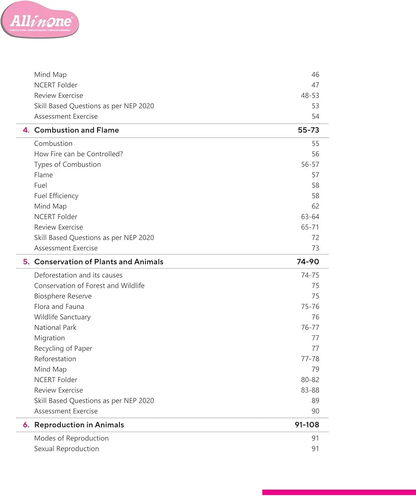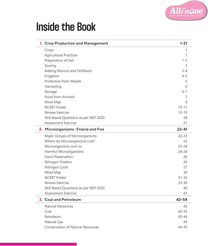 Crop Production and Management, Microorganisms: Friend and Foe, Coal and Petroleum, Combustion and Flame, Conservation of Plants and Animals, Reproduction in Animals, Reaching the Age of Adolescence, Force and Pressure, Friction, Sound, Chemical Effects of Electric Current, Some Natural Phenomena, Light, Explanations of Skill Based Questions, Sample Question Papers (1-3)