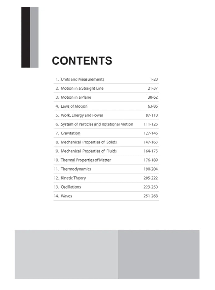 INTRODUCTION OF THE SERIES While NCERT textbooks cover fundamental concepts, NCERT Exemplar Books provides students with challenging practice problems beyond the standard NCERT textbooks. These questions deepen the understanding of concepts, develop critical thinking skills, and prepare for more complex application-level questions asked in competitive exams. Besides this, for in-depth learning, solutions are needed. To fulfil this need, the revised edition of NCERT Exemplar Problems-Solutions Physics 11th is designed as per the latest rationalized NCERT. Chapters offer precise and detailed solutions to all the questions in the NCERT Exemplar Physics textbook. The questions that are removed from NCERT but important for competitive exams are added at the end of each book. With new features like Thinking Process, Concept Insight, Alternate Method, and Mistake Alert, the series brings solutions to problems of higher aptitude. WHO WILL BENEFIT? • Class 11th student KEY FEATURES OF THE BOOK • Precise and detailed solutions to all the questions in the NCERT Exemplar Physics textbook • Each solution is complemented by explanatory notes and authentic explanations • Thinking process provides simple steps to approach and solve the question • Concept Insight explains the main ideas and concepts needed to answer the questions correctly • Alternate Method provides additional approaches to solve a problem • Mistake Alert points out common mistakes students might make and helps them avoid these errors • Notes highlight important points and useful tips to make learning easier WHY CHOOSE THIS BOOK? This book, NCERT Exemplar Problems-Solutions Physics 11th furnishes precise, detailed and authentic solutions as per the latest rationalized NCERT, enabling students to deepen their conceptual understanding and enhance their analytical skills. TABLE OF CONTENTS Units and Measurements, Motion in a Straight Line, Laws of Motion, Work, Energy and Power, System of Particles and Rotational Motion, Gravitation, Mechanical Properties of Solids, Mechanical Properties of Fluids, Thermal Properties of Matter, Thermodynamics, Kinetic Theory, Oscillations, Waves