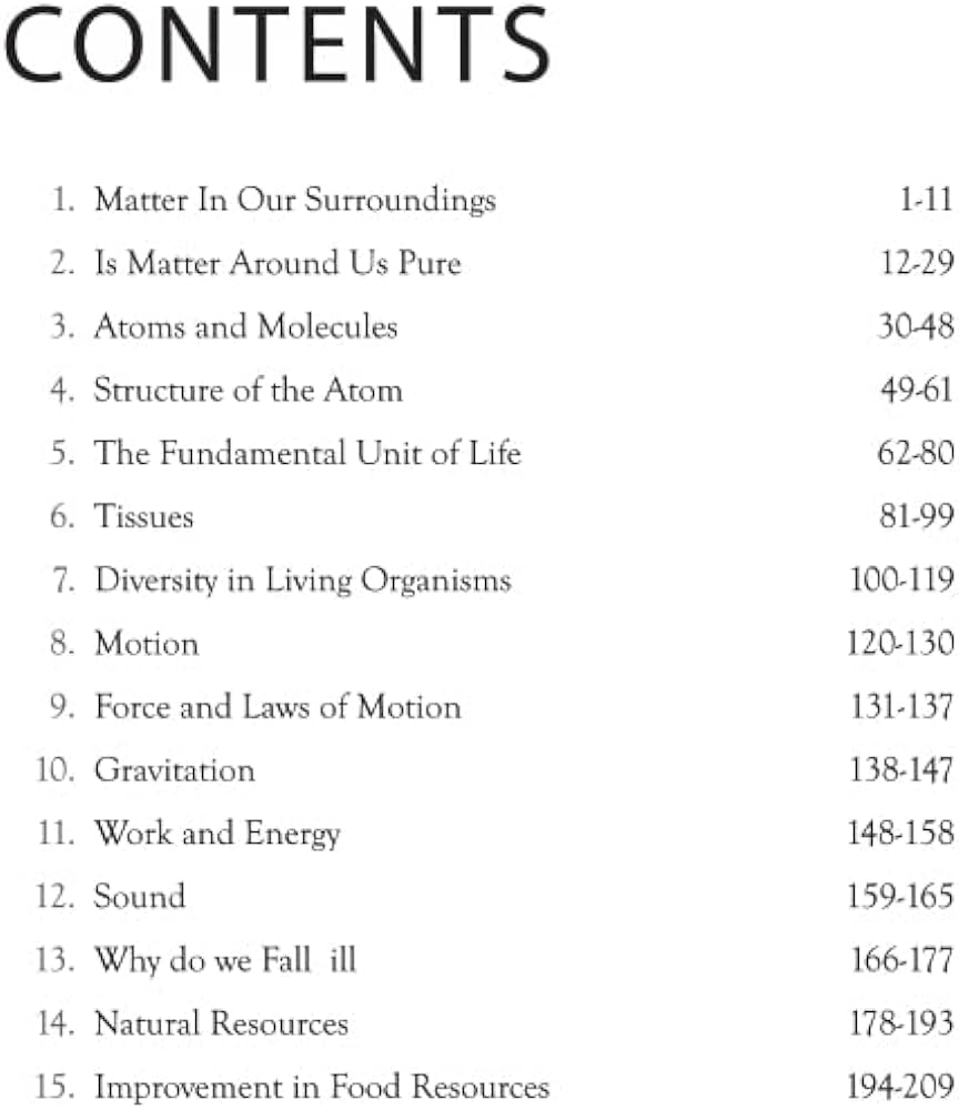Matter in our Surroundings, Is Matter Around Us Pure, Atoms and Molecules, Structure of the Atom, The Fundamental Unit of Life, Tissues, Diversity in Living Organisms, Motion, Force and Laws of Motion, Gravitation, Work and Energy, Sound, Why do we Fall ill, Natural Resources, Improvement in Food Resources