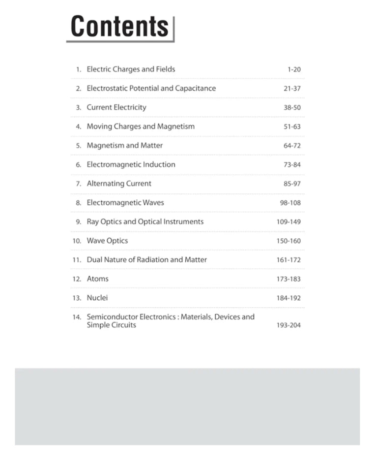 Electric Charges and Fields, Electrostatic Potential and Capacitance, Current Electricity, Moving Charges and Magnetism, Magnetism and Matter, Electromagnetic Induction, Alternating Current, Electromagnetic Waves, Ray Optics and Optical Instruments, Wave Optics, Dual Nature of Radiation and Matter, Atoms, Nuclei, Semiconductor Electronics: Materials, Devices and Simple Circuits