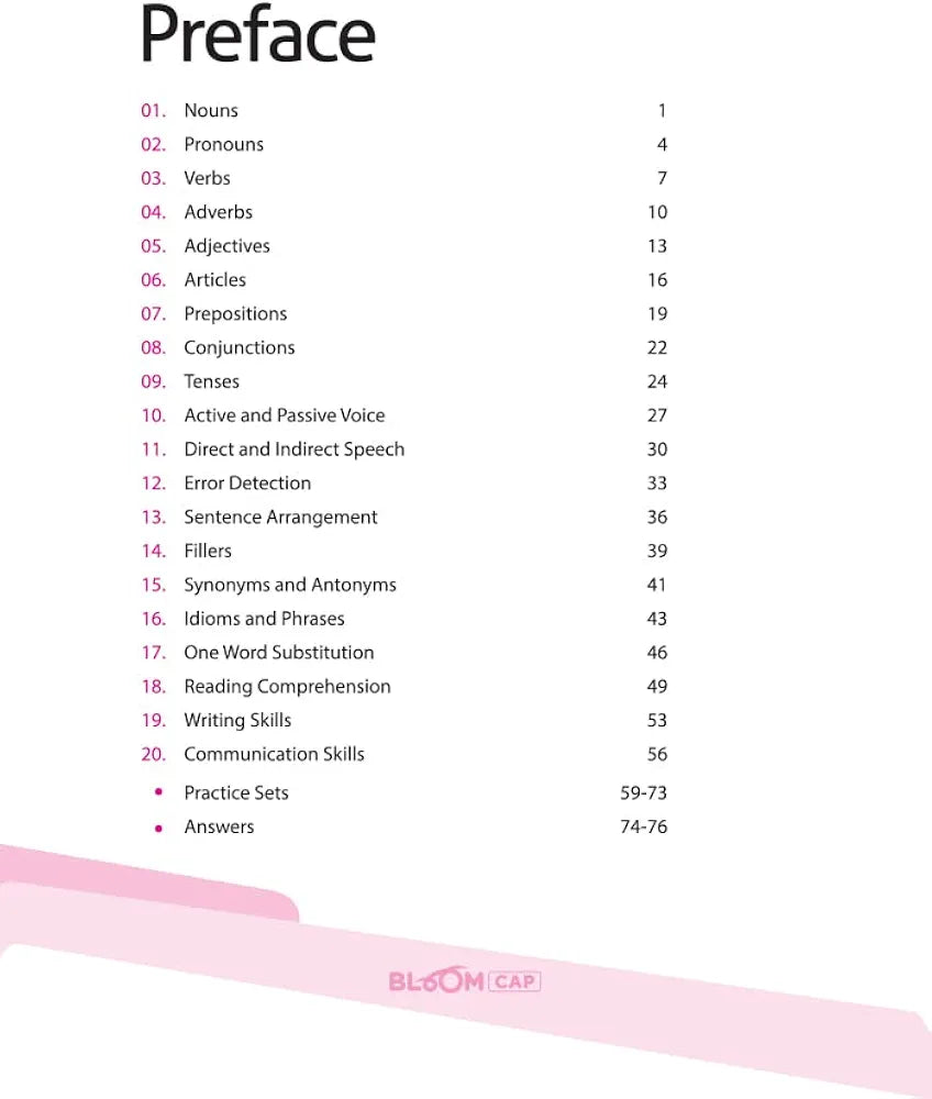 Nouns, Pronouns, Verbs, Adverbs, Adjectives, Articles, Prepositions, Conjunctions, Sentences, Tenses, Active and Passive Voice, Direct and Indirect Speech, Error Detection, Sentence Arrangement, Fillers, Synonyms and Antonyms, Idioms and Phrases, One Word Substitution, Reading Comprehension, Writing Skills, Communication Skills, Practice Sets, Answers