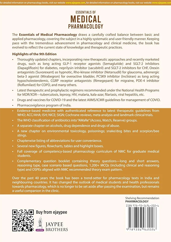 The 9th Edition (Revised Reprint) of Essentials of Pharmacology presents thoroughly updated chapters incorporating new therapeutic advances and recently approved drugs, including Semaglutide, Dapagliflozin, Sacubitril, Suvorexant, Netarsudil, Mirabegron, Inclisiran, and Rimegepant, among others. It covers the latest treatment and prophylaxis guidelines under the National Health Programs and includes updated COVID-19 drugs, vaccines, and ICMR/AIIMS management protocols. The edition emphasizes evidence-based medicine with references from WHO, ACC/AHA, NICE, SIGN, and Cochrane reviews, and includes the WHO AWaRe antibiotic classification. New chapters on drug dependence, environmental toxicology, and poisonings enhance clinical relevance. A complementary question booklet with over 1,200 MCQs, reasoning, case-based, and OSPE questions aligned with the NMC curriculum makes this edition a complete learning and exam-preparation package for medical students.
