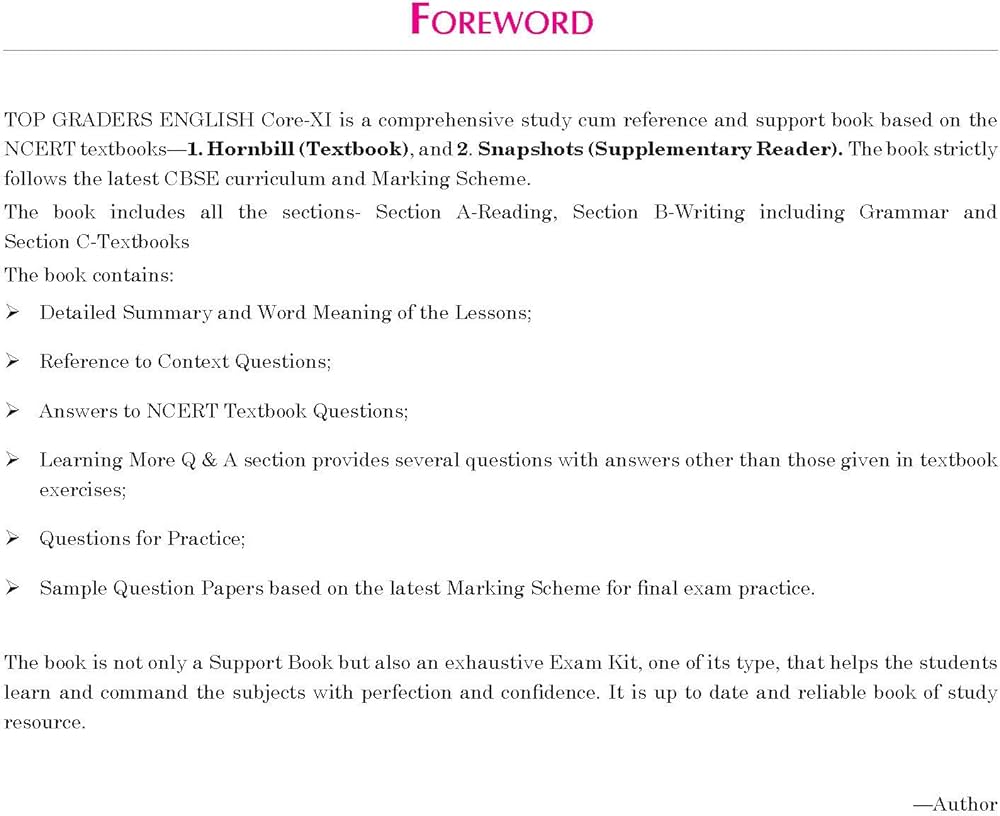 Includes: Reading/ Writing Skills & Grammar - NCERT Textbooks-HORNBILL and SNAPSHOTS - Summary of the Lessons, Word Meanings - Reference to Context Questions - Answers to NCERT Textbook Questions - Learning More Q & A consisting of Solved & Unsolved Questions - Sample Question Papers The Series at a Glance TOP GRADERS The most Up-to-date, Reliable and Comprehensive series of Study-cum-Reference Books which creates confidence in learners to achieve Top Grades!!! - Strictly based on NCERT Textbooks and CBSE Curriculum - Follows Uniform System of Assessment as issued by CBSE - Conceptualised, developed and designed by experienced Authors - Evaluated and scrutinised by reputed academicians - Ensures clear understanding of the subjects through its CONTENT, APPROACH and PRESENTATION Features: Understanding the Lesson providing the Summary of the Lesson - Reference to Context Questions - Solutions to NCERT Textbook Exercises - A number of Additional Questions with Answers for complete command over lessons - Questions for Practice - Sample Question Papers