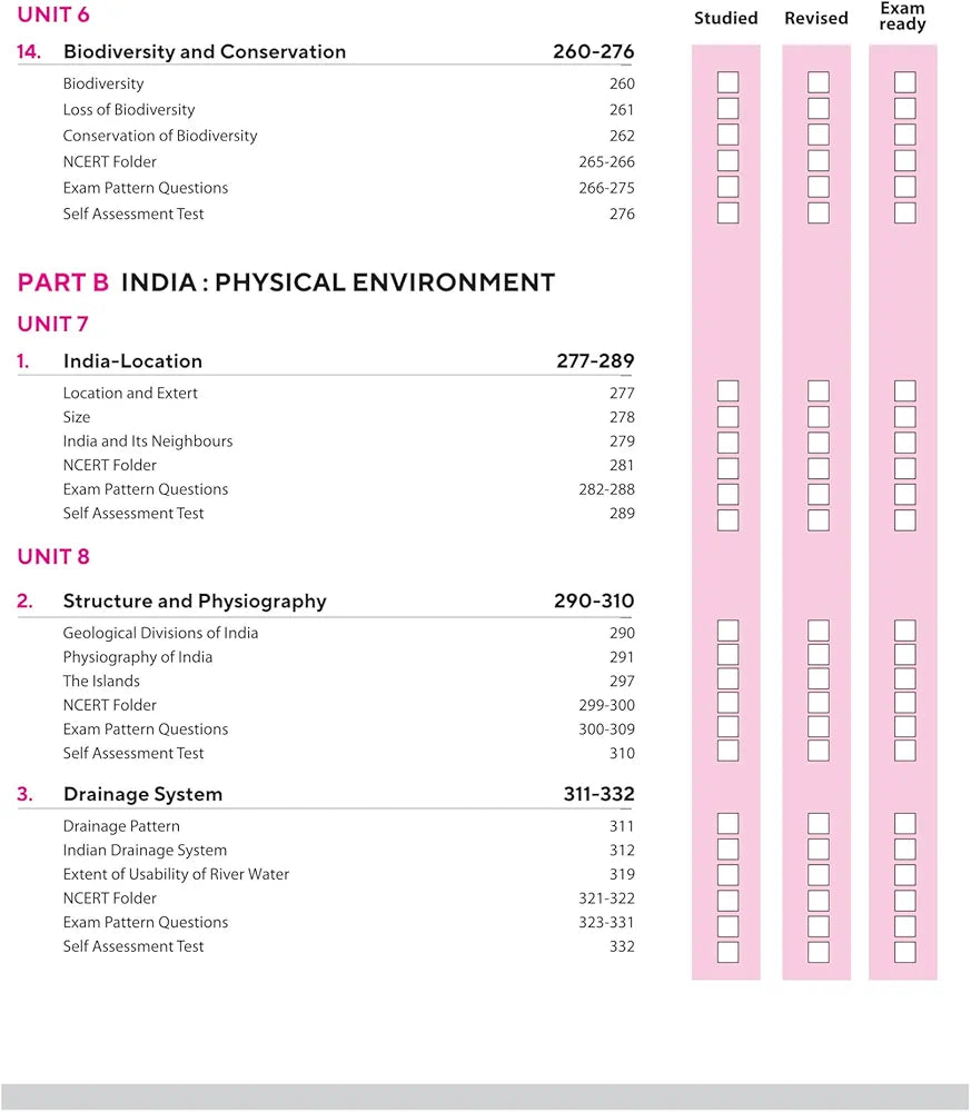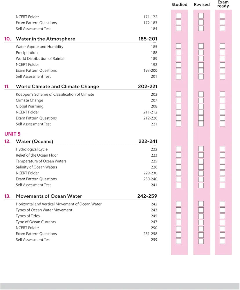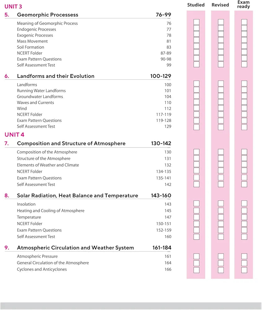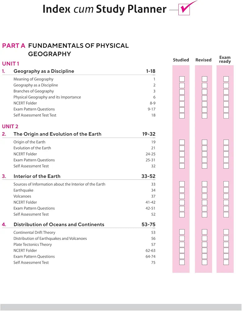Geography as a Discipline, The Origin and Evolution of the Earth, Interior of the Earth, Distribution of Oceans and Continents, Geomorphic Processes, Landforms and their Evolution, Composition and Structure of Atmosphere, Solar Radiation, Heat Balance and Temperature, Atmospheric Circulation and Weather System, Water in the Atmosphere, World Climate and Climate Change, Water (Oceans), Movements of Ocean Water, Biodiversity and Conservation, India-Location, Structure and Physiography, Drainage System, Climate Natural Vegetation, Natural Hazards and Disasters, Practical Work, Sample Question Papers (1-3)